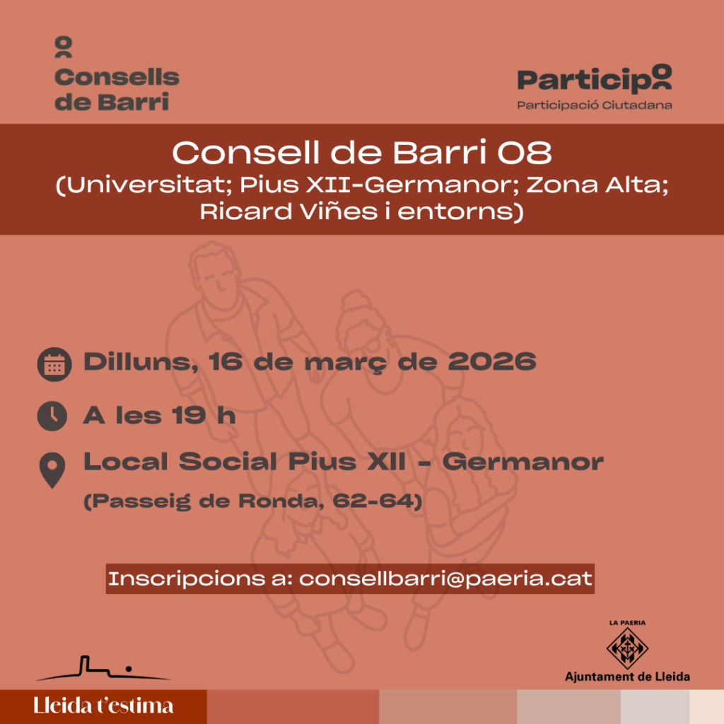 És imprescindible que ens confirmeu l’assistència a l’esdeveniment al correu: consellbarri@paeria.cat