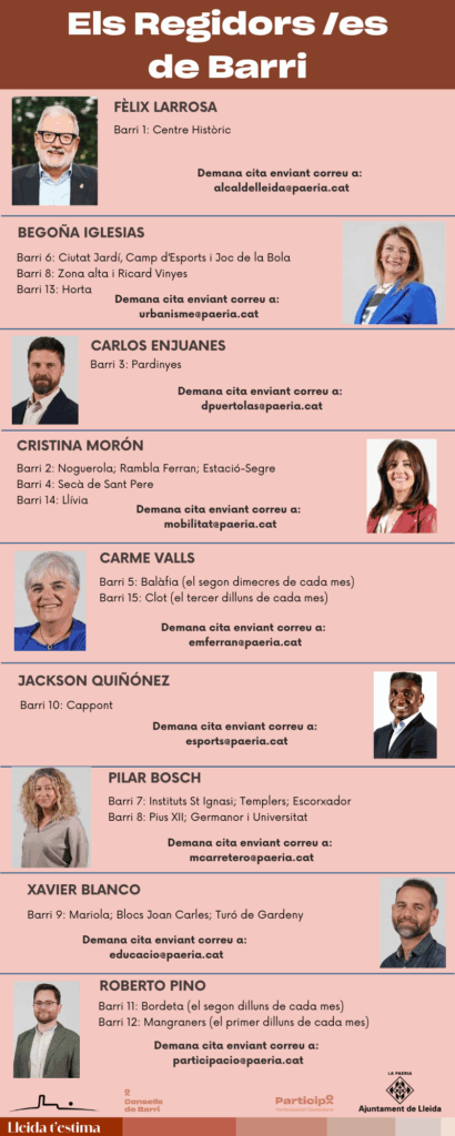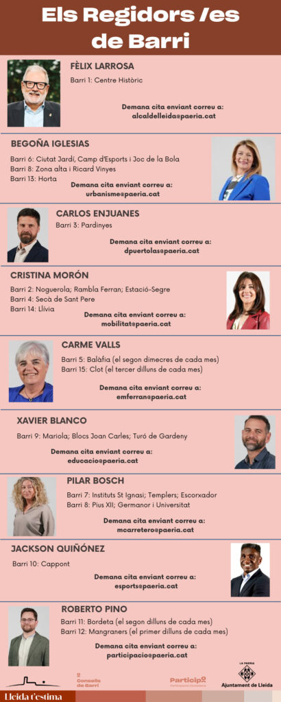Els Regidors i Regidores de Barri són el canal de proximitat entre l’Ajuntament i la ciutadania, permetent un contacte directe per escoltar i atendre les necessitats dels diferents barris de Lleida.